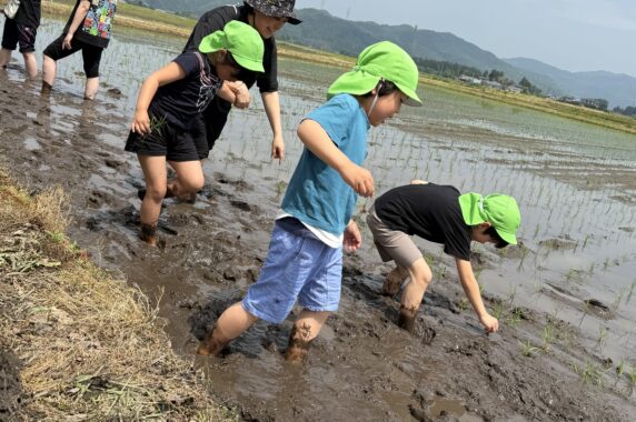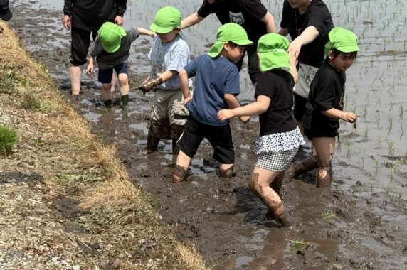 今日は、暑いくらいでしたが、暑さに負けず、年長組15名が、田植え体験を楽しんできました。