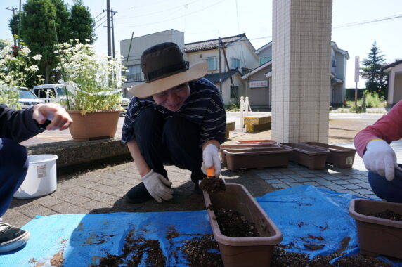 まずはプランターに土を入れます。なるべく均等になるように入れていただきました。