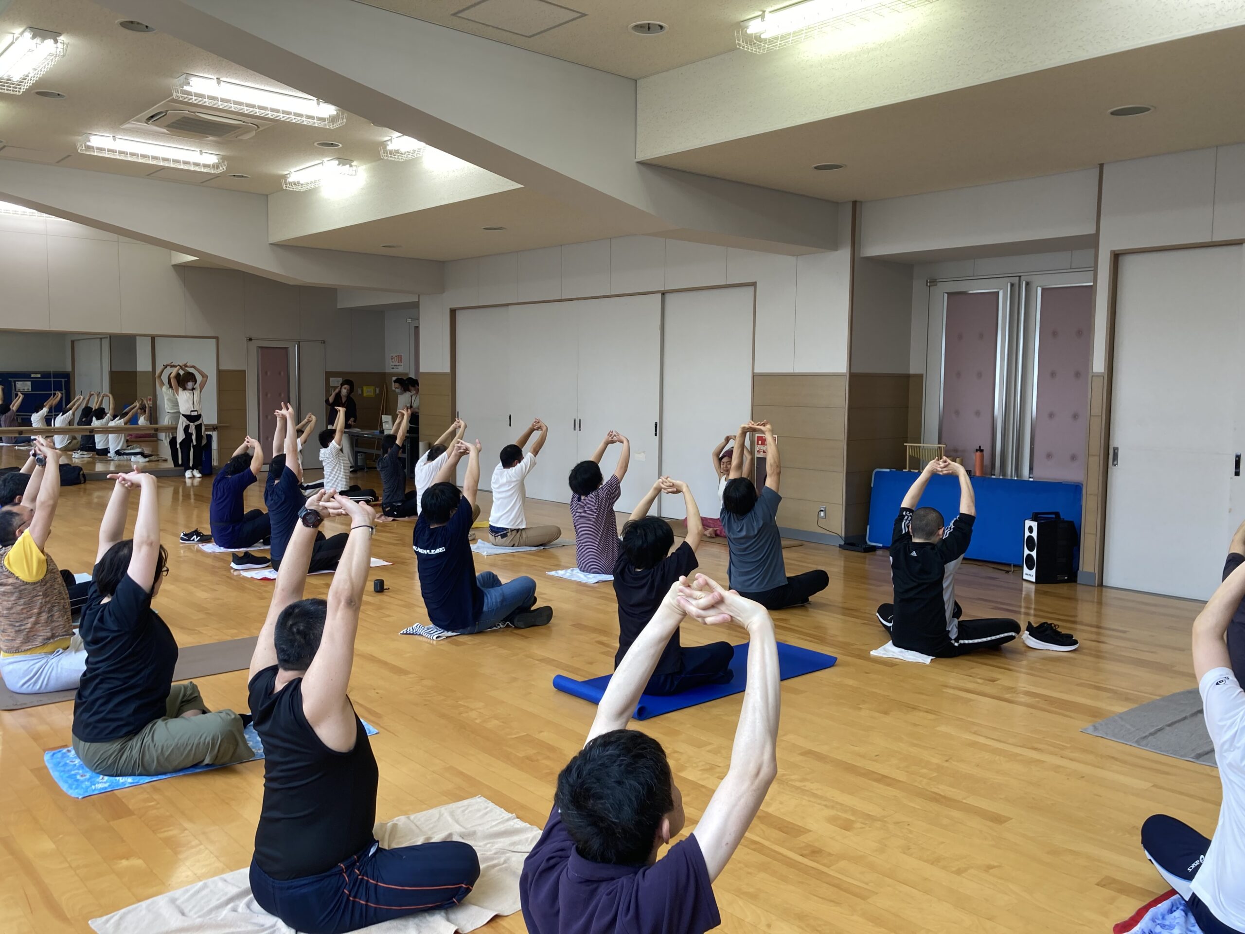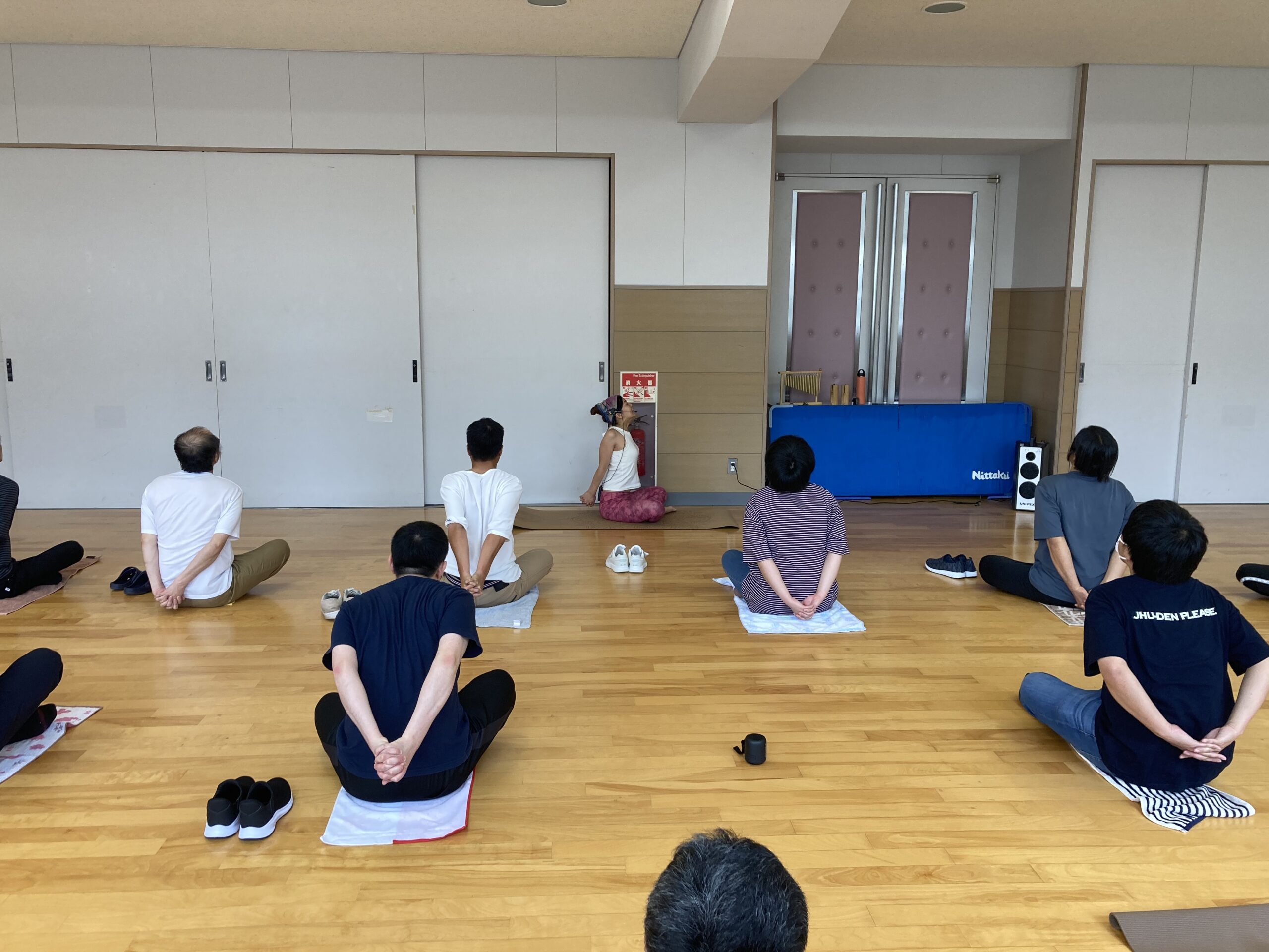 26名の参加者がサンビレッジ新発田に集まり、ヨガインストラクターの佐藤あいろ先生のご指導のもと