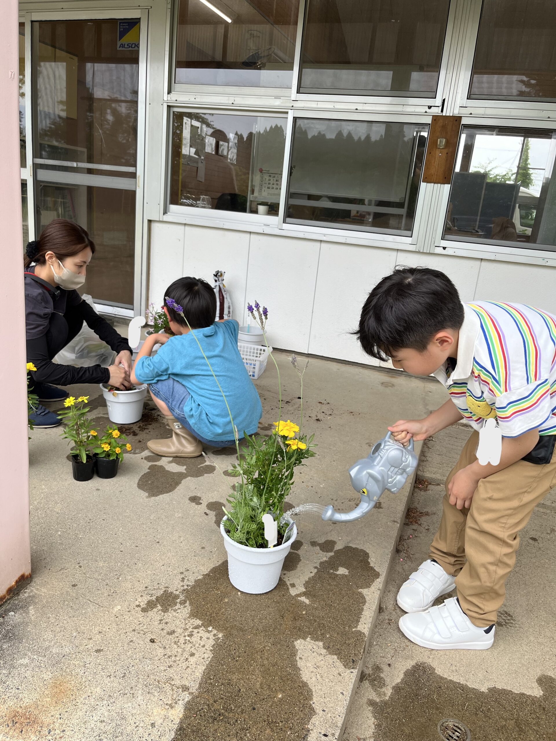 植えた後はたっぷりお水をあげてくれました。 自分のお花を見つけてお水をあげています!