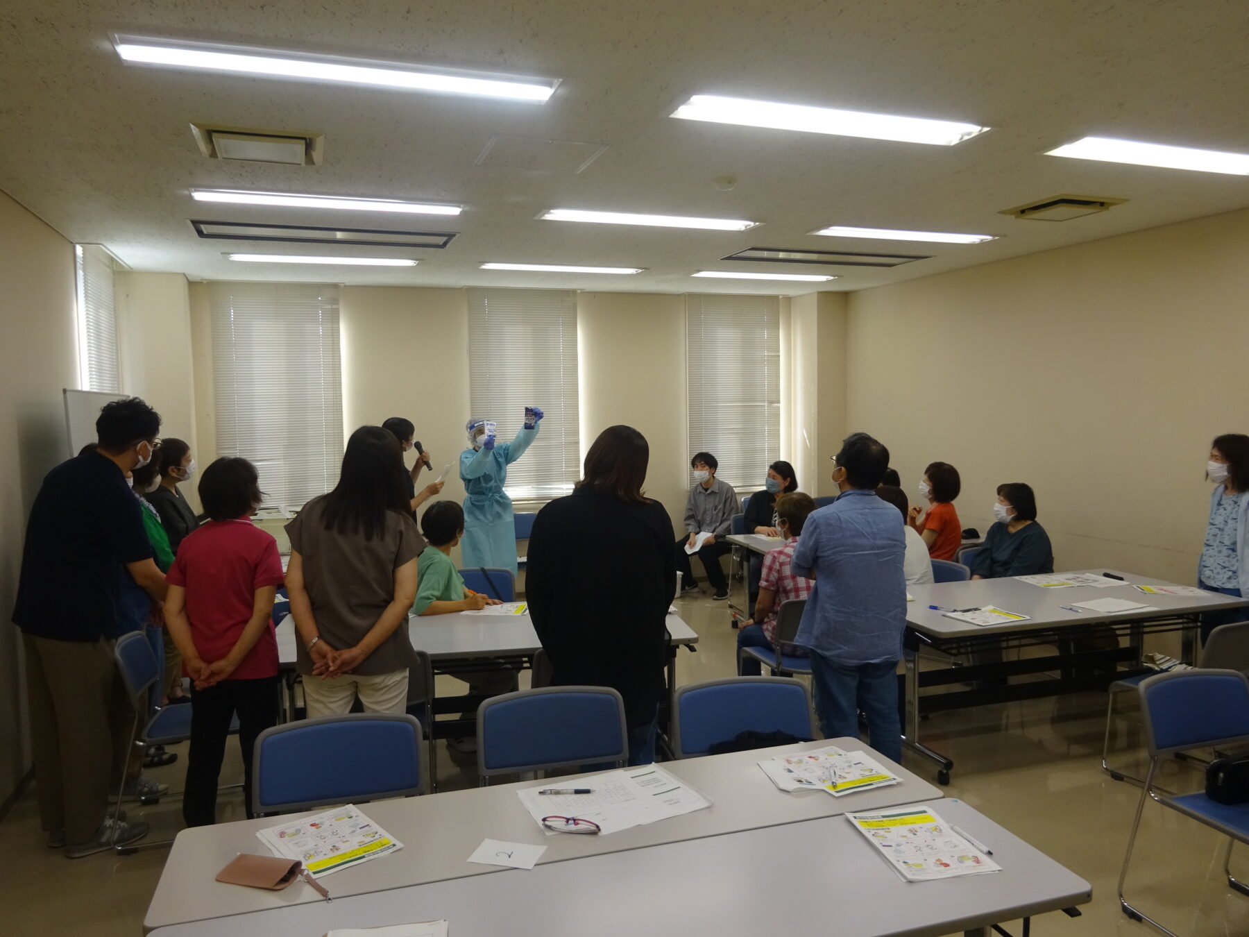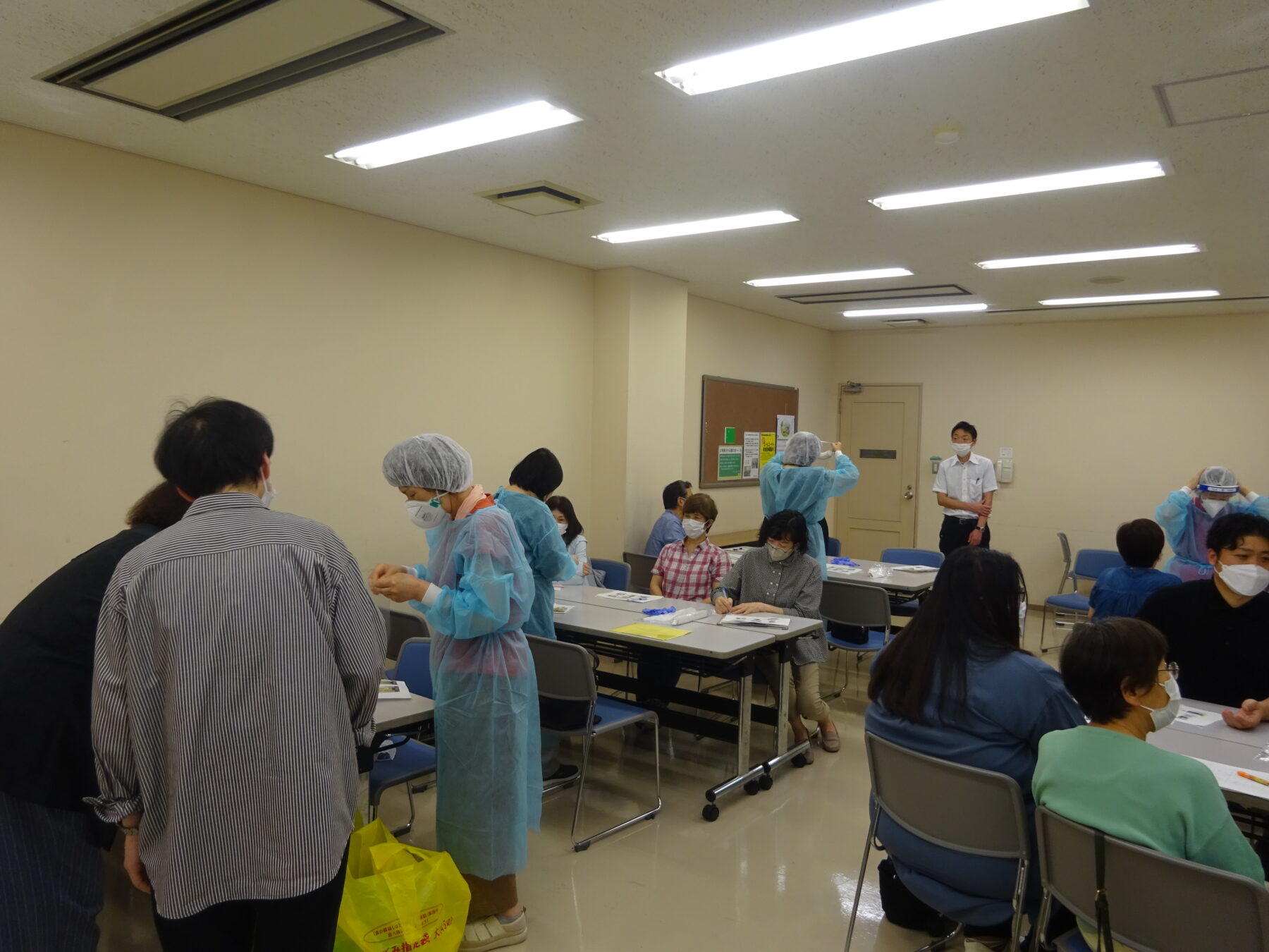 次に防護服の着脱の訓練を行いました。グループごとに実際に防護服を使用し、正しい着脱について学びました。