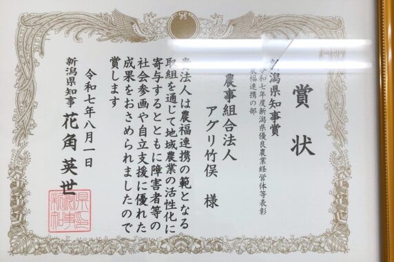 令和7年度新潟県担い手経営発展推進大会にて、優良農業経営体等表彰「農福連携の部」で新潟県知事賞を受賞しました!
