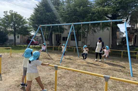「30秒数えたら代わってね。」と友だち同士で約束をしながら、順番にブランコを楽しむ姿が見られました。秋の風を気持ちよさそうに感じています☆
