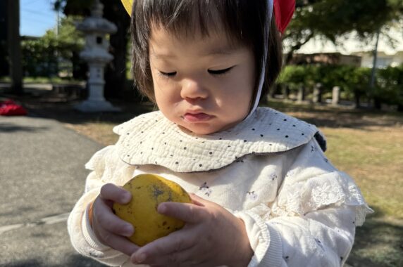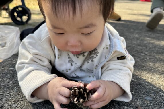 落ち葉や木の実、松ぼっくりなどを拾って、「これはなんだろう?」という表情をしながらじっと見つめたり、嬉しそうに見せてくれる子どもたちでした😊🍂