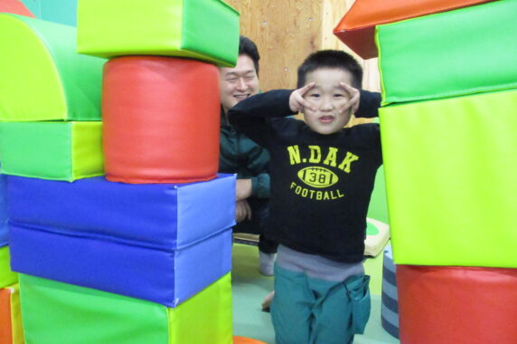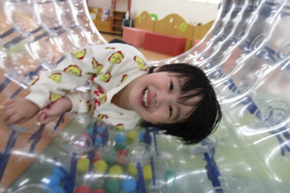 大きなトランポリンでお母さんと手を繋いで仲良くジャンプ!!ボールプールの滑り台を何度も滑ったり、サイバーボールをお母さんに押してもらってグルグル大回転したりと大興奮の子どもたちでした♪