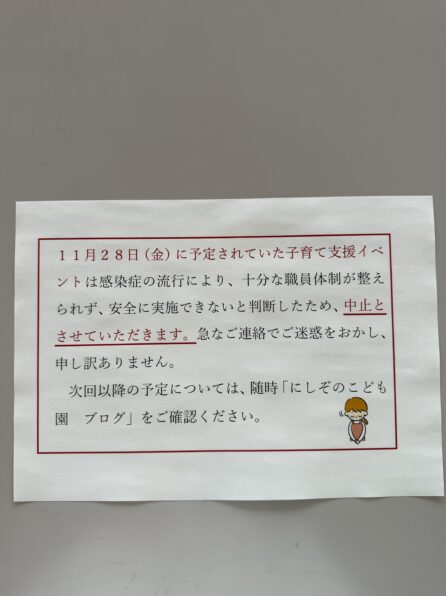 明日、11月28日(金)の子育てイベントは中止とさせていただきます。
