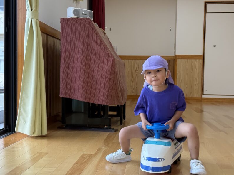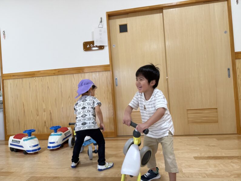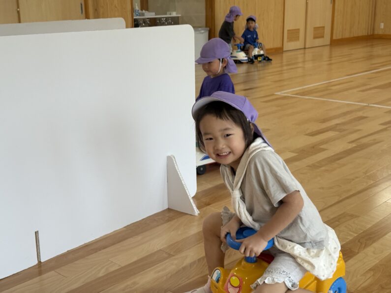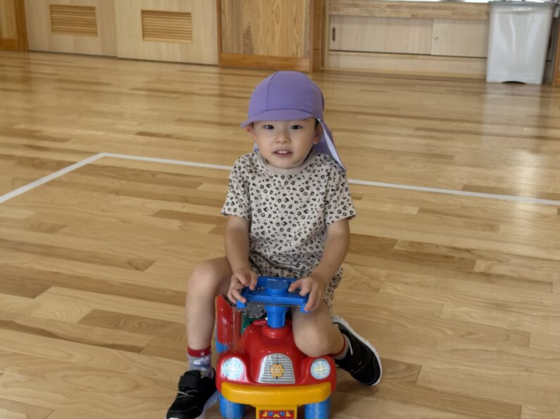 遊戯室に行くと必ず「車がいい!」とリクエストする子どもたち。飽きることなく広い遊戯室を走らせています。