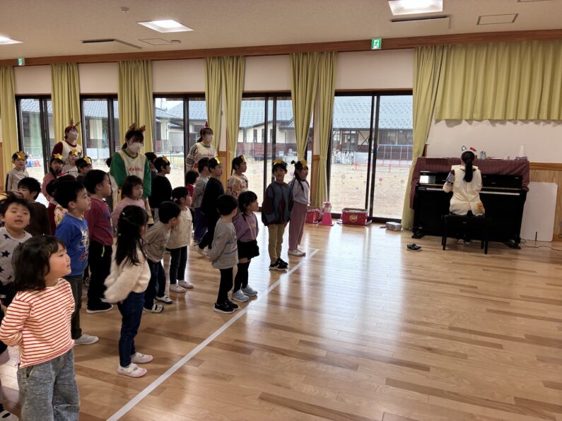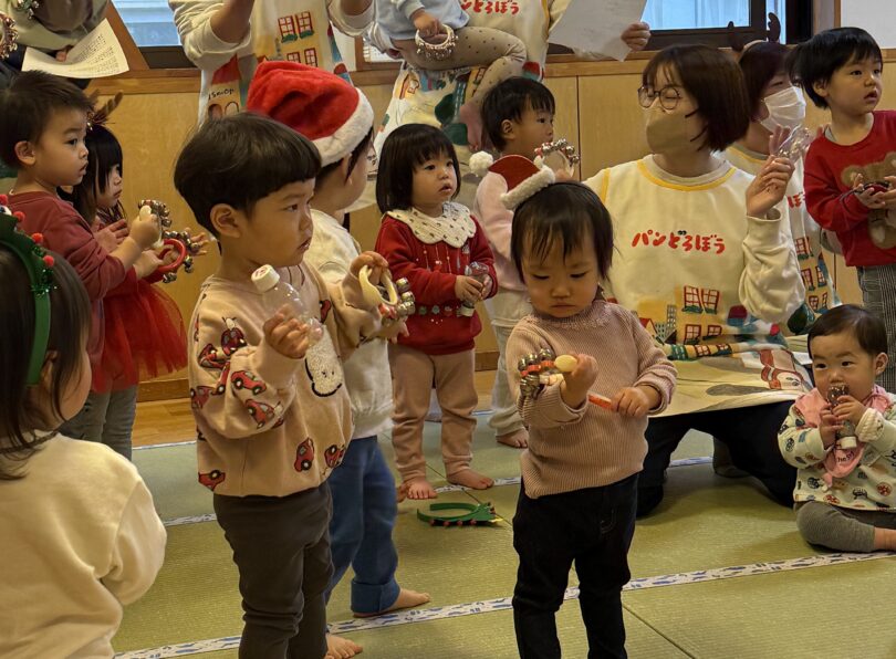 乳児クラスの子どもたちは、「ジングルベル」を歌いました。タンバリンや鈴、カスタネットにオリジナルのマラカスを鳴らしながら楽しい雰囲気の中で歌を歌いました♪とっても可愛かったです💓