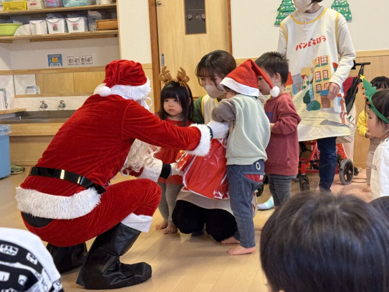 「わぁー!サンタさんだ!」と喜ぶ子や少し緊張する子もいましたが、笑顔でサンタさんをお出迎え☆