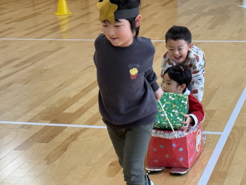 続いて・・・クリスマスゲーム「ソリに乗ってプレゼントを運ぼう!」を行いました。3クラスで縦割りのチームに分かれて異年齢で協力し合いながらゲームを楽しみました😊