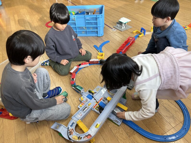 プラレールでは、「ここにつなげよう!」「次は僕の番ね。」と言葉でやり取りしながら、友だちと一緒に線路づくりを楽しむ姿が見られました。