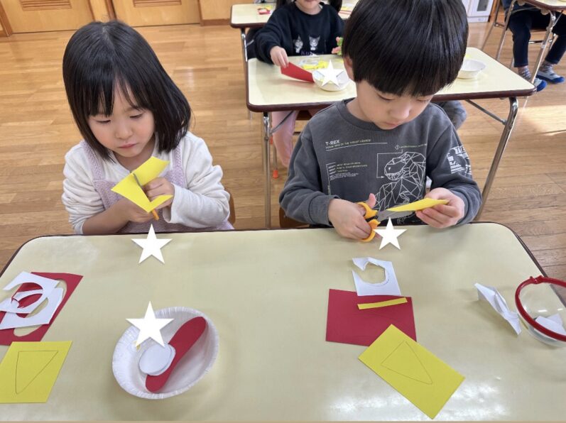 制作では、節分に向けて鬼のお面作りに取り組んでいます。