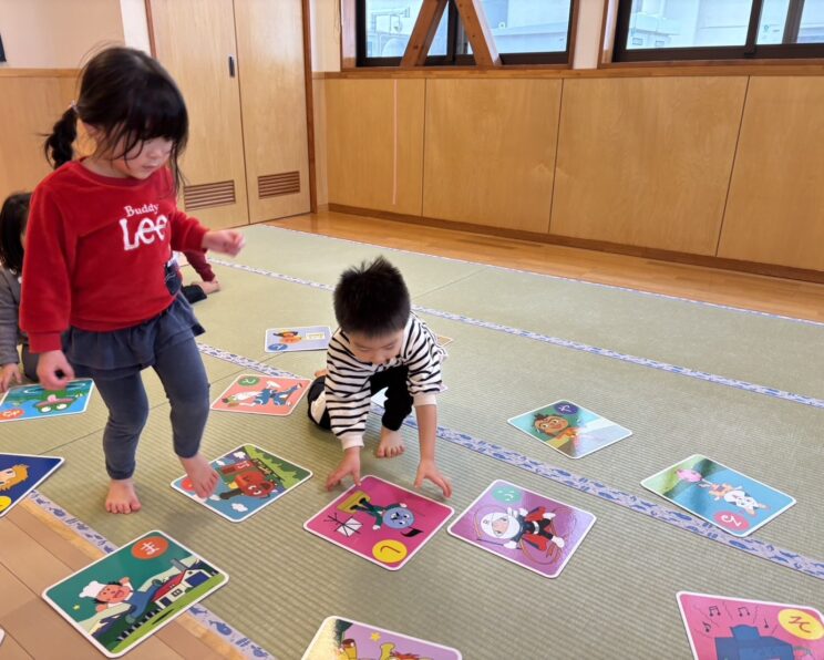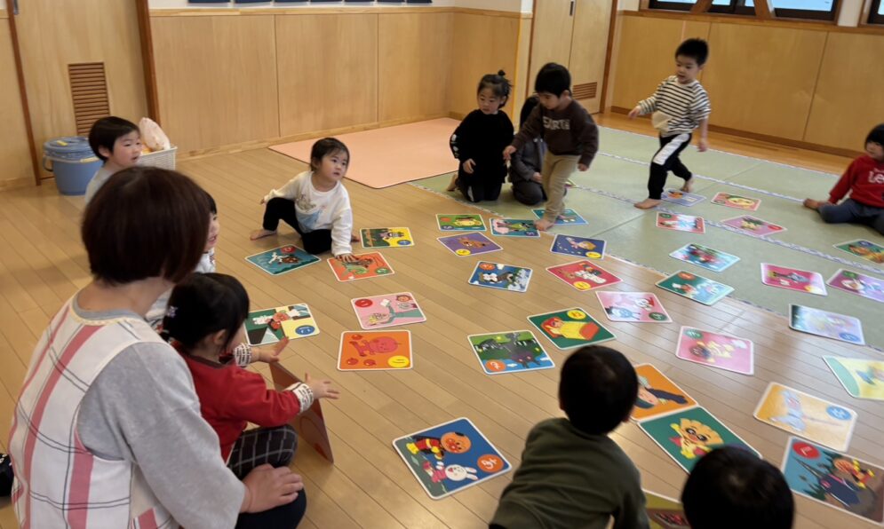 また、新年おめでとう会に参加し、お正月遊びに興味津々!まずはカルタ取りを楽しんでいます。みんながよく知っているアンパンマンのジャンボカルタでは、「あった!」「これだ!」と自信満々に絵札を取り、とっても嬉しそうにしていました。ジャンボカルタだけでなく、普通サイズの『ごちそうカルタ』も楽しんでいます!福笑いや、コマ回しなども順に楽しんでいきたいと思います。