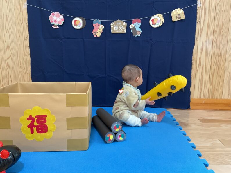 節分のフォトスペースでは、鬼の金棒や恵方巻に興味津々!手に取って遊んだり、記念撮影を楽しんだりしました📸✨