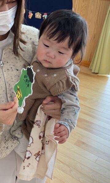 「鬼のお面作り」では、ママと一緒にお花紙をくしゅくしゅさせて鬼の髪の毛にしたり、シールになっている目や鼻をペタッと貼ったりして可愛い鬼のお面が完成しました✨