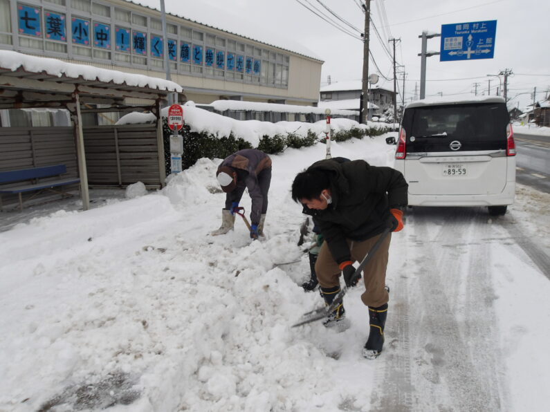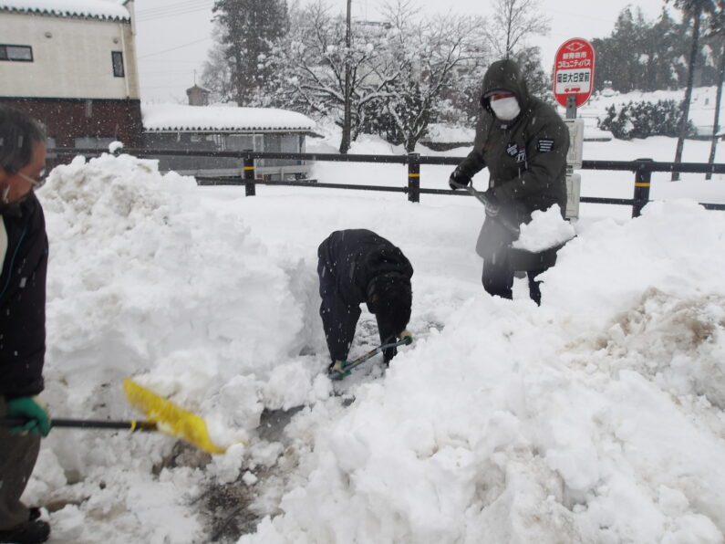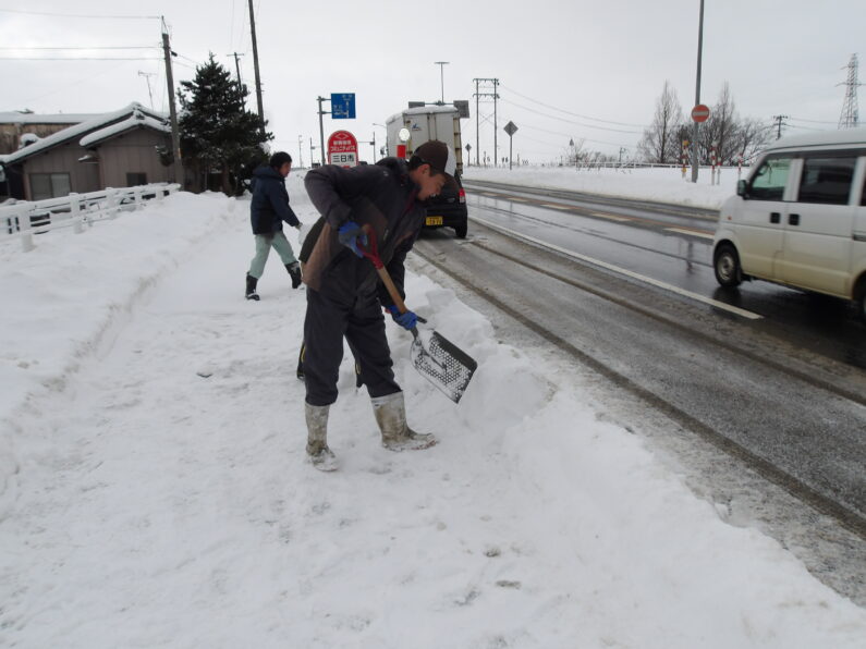 ご利用者は職員と一緒に、スコップを使ってバス停周辺の雪を丁寧に取り除きました!