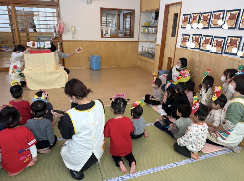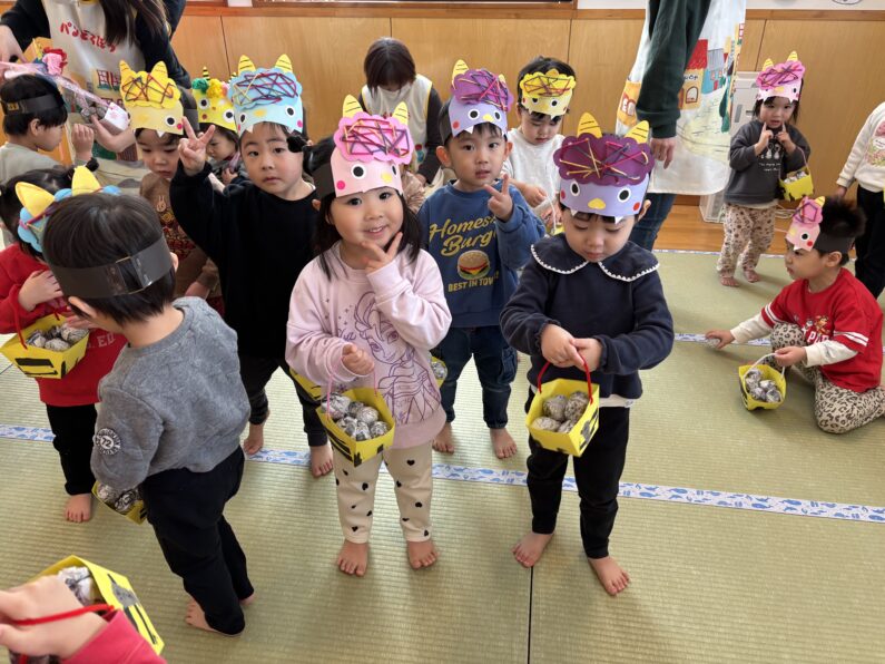 幼児クラスでは、まず節分の由来についてのお話を聞きました。ヒイラギイワシのお話や鬼のクイズにうなずいたり、自分なりに考えながら話を聞く姿が見られましたよ😊
