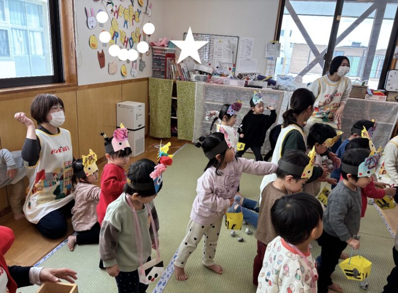 鬼の登場に少し怖がる姿も見られましたが、「おにはそと!ふくはうち!」の掛け声とともに、友だちと一緒に元気いっぱい豆まきを楽しみました。
