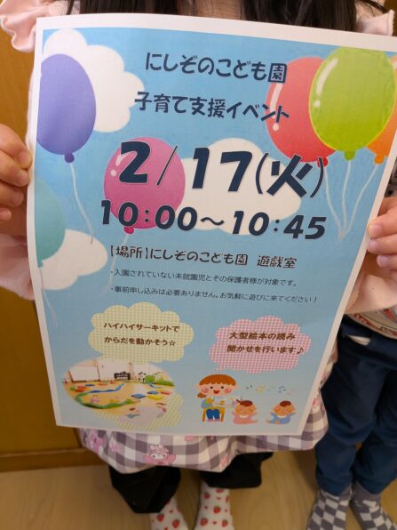そんな週末が終わると2月17日(火)にしぞのこども園にて、2月の子育て支援イベントを開催いたします!
