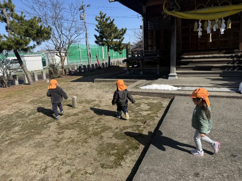 みかん組(1歳児)です!先週はお天気の良い日があったため、みんなの大好きな神社に行ってきました!神社に行くことを伝えると「やったー!」と喜ぶ姿が見られました😊
