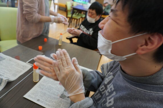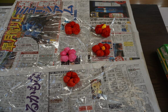 まずは季節の花である”梅の花”を作っていきます。手袋の上にのりを塗り、丸めたお花紙をコネコネと成形していきます。