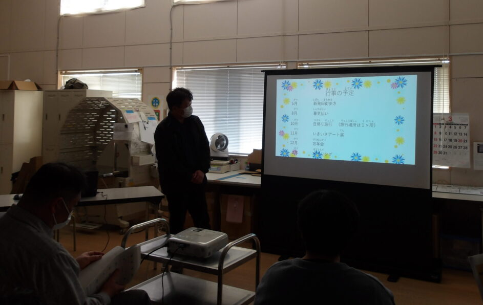 スクリーンや配布資料をご覧いただきながら、令和8年度の職員紹介と工賃について説明を行いました。