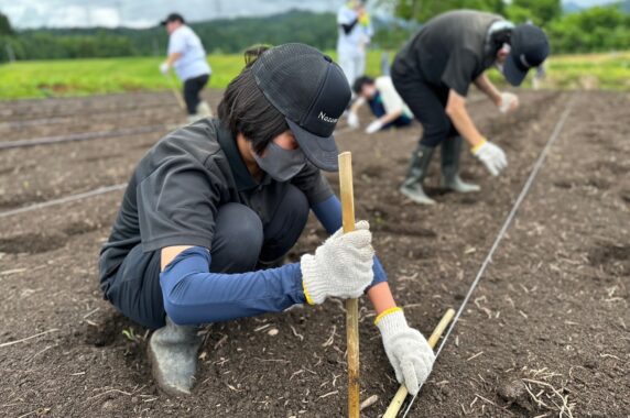 まず、午前中は、今年から新たに上三光地区の地元農家さんにご協力をいただいて栽培を行えるようになった畑での種蒔き作業です。この畑は元々アスパラ畑だった休耕地を活用した農地です。