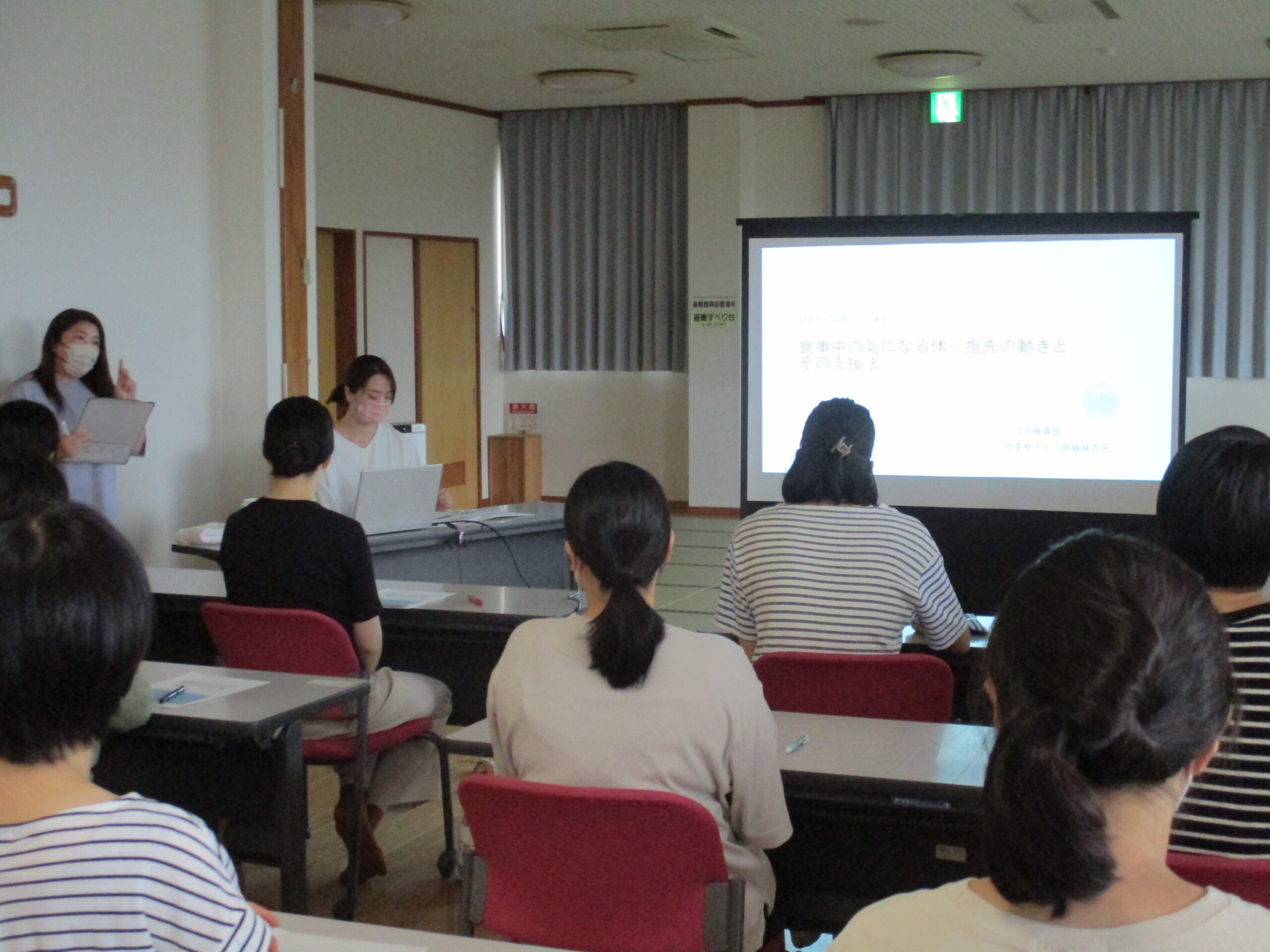 保護者の方から食事中お子さんの姿勢が気になるというご意見がありました。講師の斎藤さんからは良い姿勢=食べやすい姿勢となり良い姿勢ができるようになってから細かなスプーンの使い方ができるようになっていくとのお話もありました。また、良い姿勢や上手なスプーン操作ができるようになるためにご自宅で行なえる環境設定と遊びの中でできる取り組みを教えていただきました。