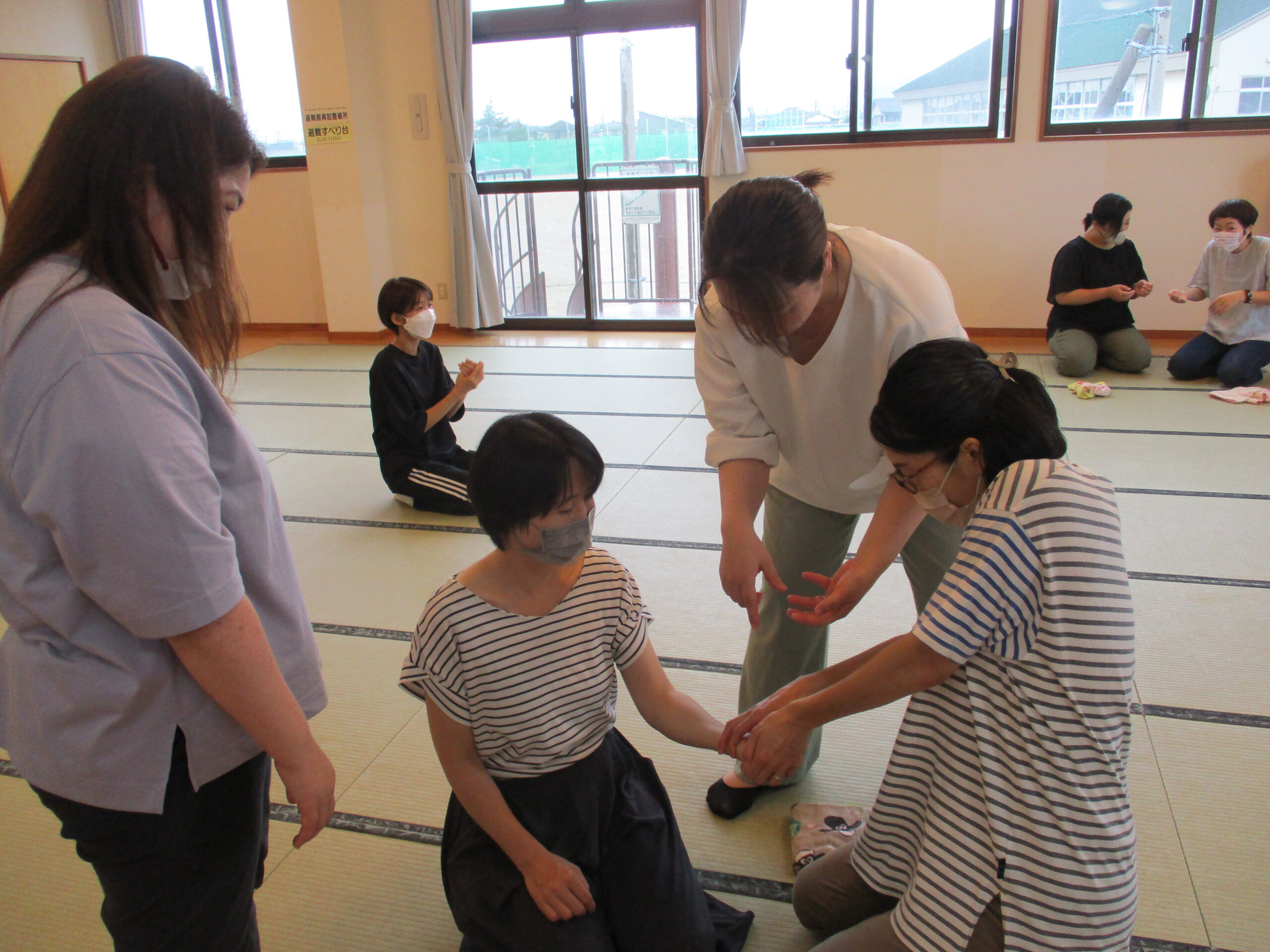 昨年度も開催したマッサージ講習会が今年も7月に開催されました。今回は、ひまわり学園にコンサルタントとして来ていただいている、斎藤さん(つばめ療育館 作業療法士)を講師としてお迎えし保護者の方を対象に講習会を行いました。