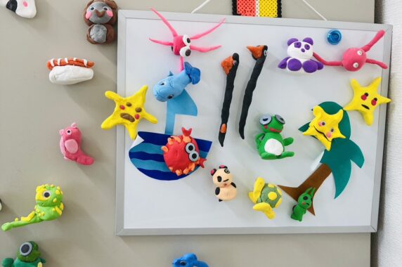 こちらは、出来上がってからマグネットを付けて飾っています。とてもカラフルで見ていて楽しいです。