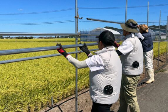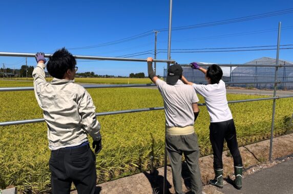 昨年までは、稲架(はさ)の代わりに、新発田竹俣特別支援学校様のフェンスをお借りして作っていたのですが、今年からは念願だった稲架(はさ)を設置して天日干し米を作ることができます(^^)