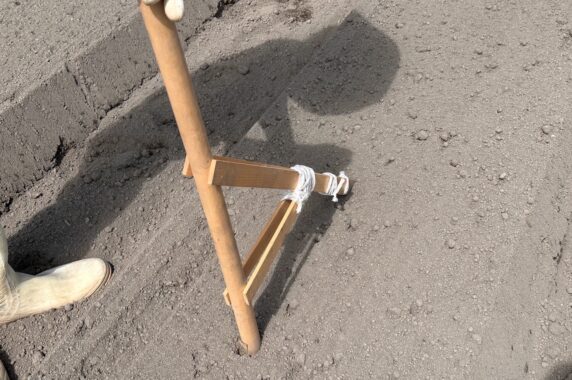 畝を立てたところに、道具を使って等間隔に穴を空けていきます。