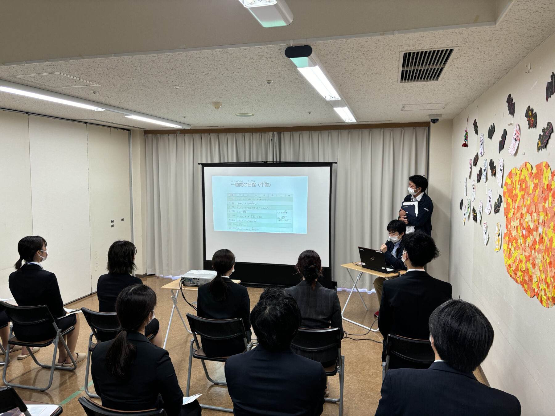 その後は緑風園とあおの風を見学し、ベテラン職員より、支援の実際やご利用者と向き合う際の姿勢について学びました。先輩たちのユーモアを交えた熱のこもった説明は、歓迎の気持ちとともに内定者のみなさんにしっかり届いたことと思います!さんさん館iに戻ってからは、年齢が近い先輩職員と懇談していただき、入職までの心構えや社会人として大切にしていることなどを教わりました。