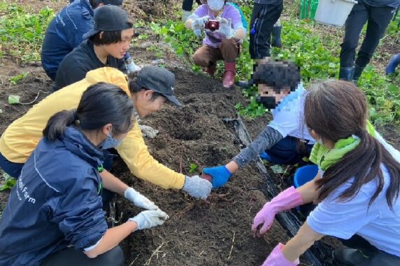 まずはさつまいも掘り作業の様子。のぞみふぁーむの利用者さんと一緒に協力してさつまいもを掘り起こしました。