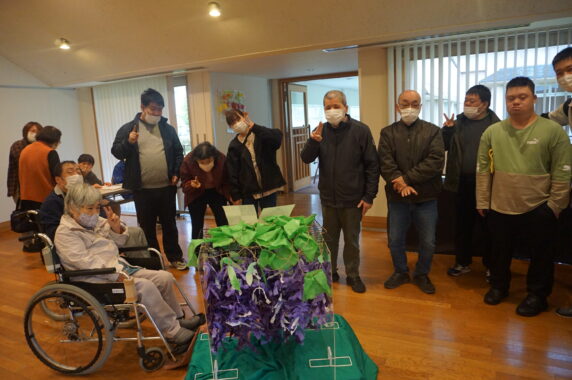 共同作品「藤の花」のディスプレイの前でパチリ。