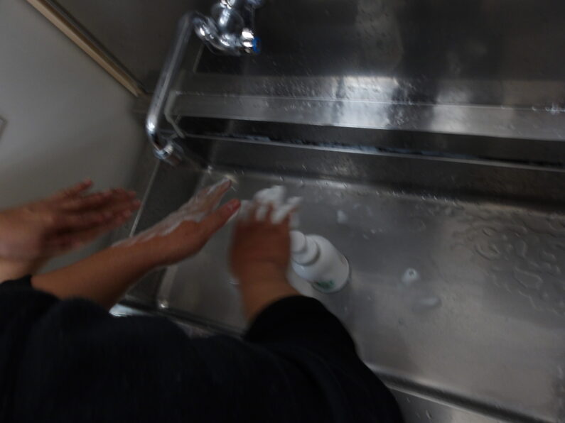 石鹸を付けて….普段何気なく洗っていますが、ここは教えていただいたやり方で手洗いを実践しました。