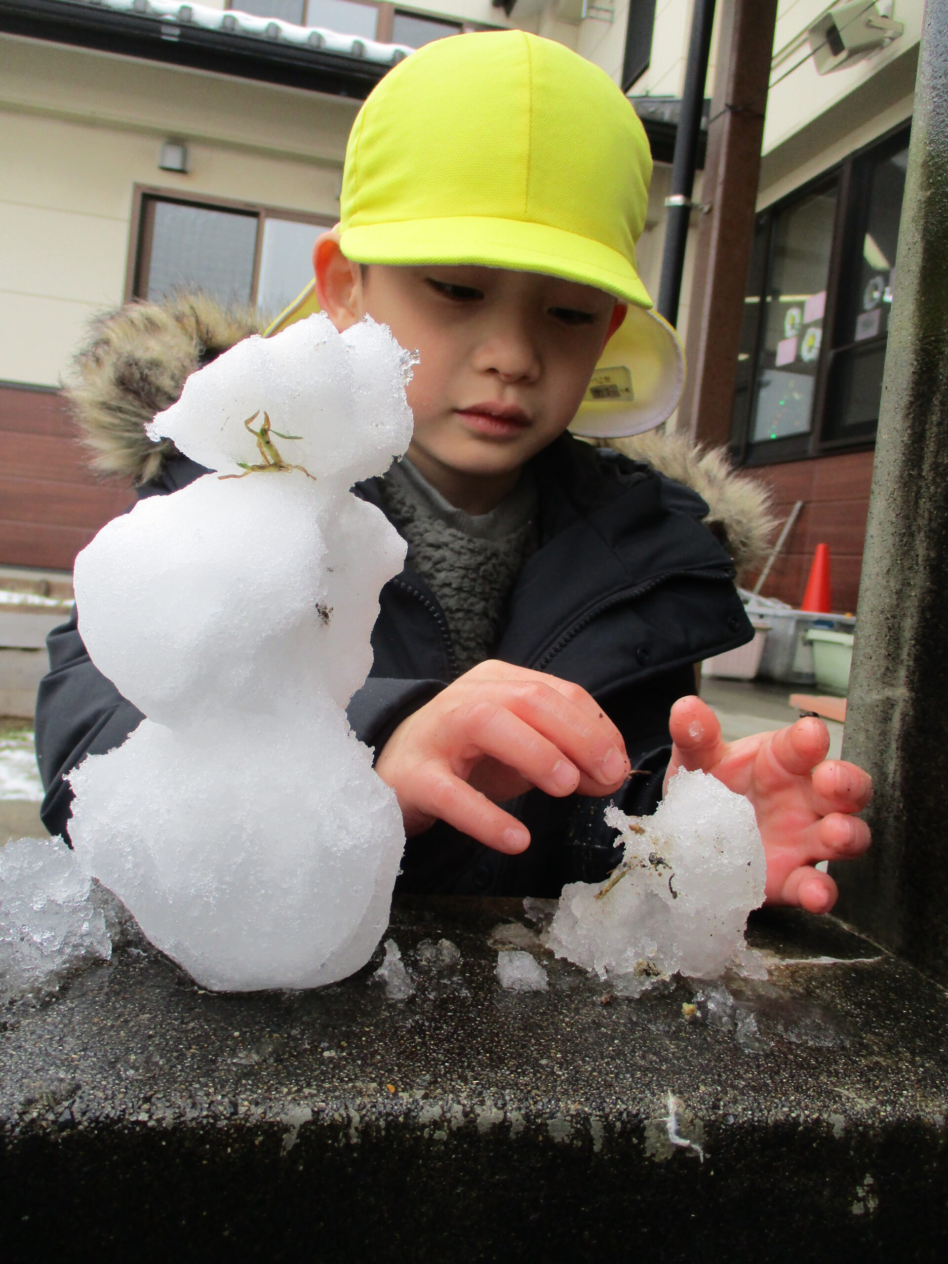 『雪だるま作りも真剣』