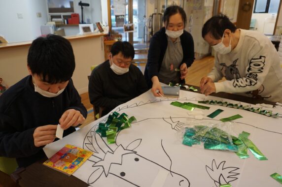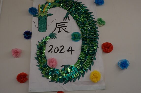 新年早々、ホールに皆さんで作った辰を飾りました。