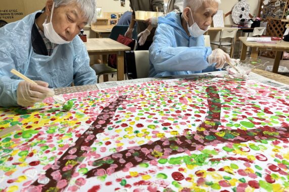 (2)「花」の絵を作成する風景です。表面が盛り上がる材料を絵の具に混ぜ、クッション性のある画材でトントンと色を乗せる作業を繰り返しました。隙間が無くなるまで皆さんで頑張りました。