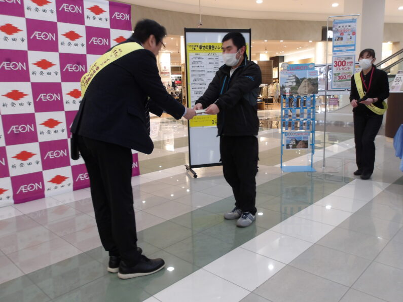 先日、イオン新発田店にて、「イオン 幸せの黄色いレシートキャンペーン」 贈呈式に、事業所を代表して、自治会役員の2名が出席してきました。