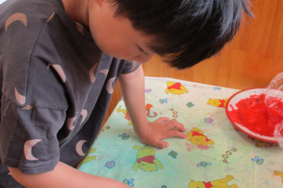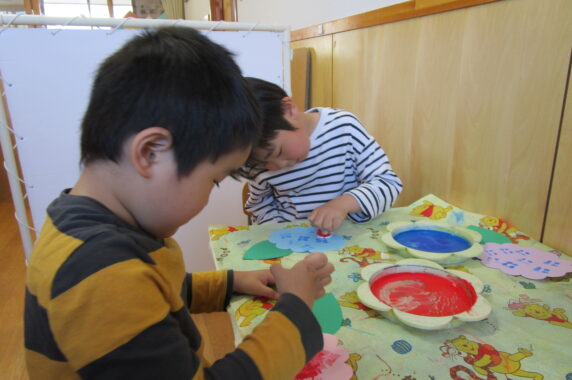 赤色、青色、白色の3色から好きな色でペタペタとスタンプを押します😊