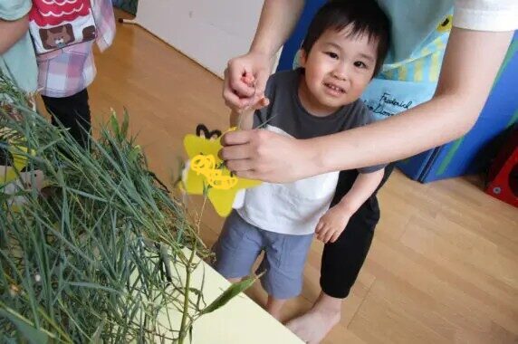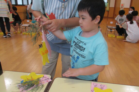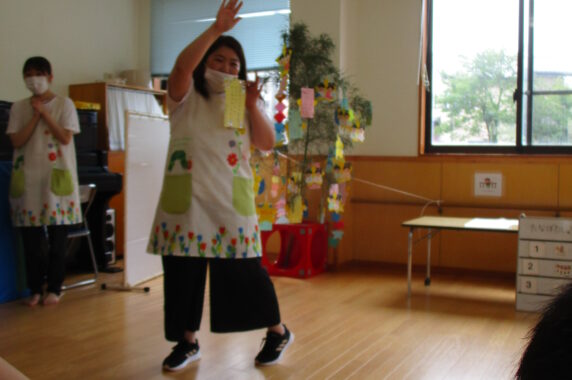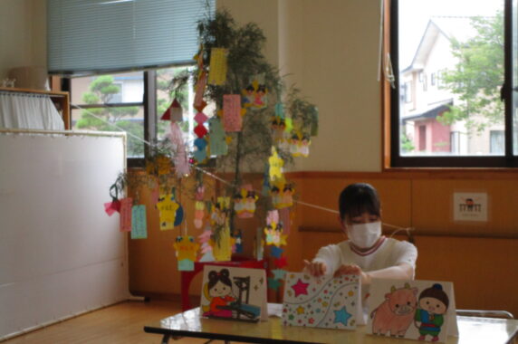 5日の七夕集会当日にはみんなで「きらきら星」を歌い、カードシアターを使って七夕のお話を聞きました。お子さんたちも興味津々で話を聞いてくれていました!!