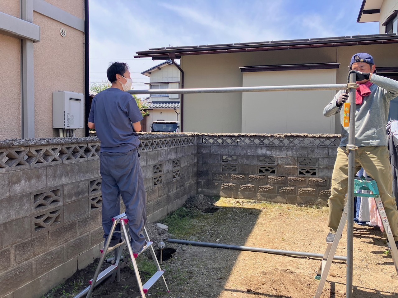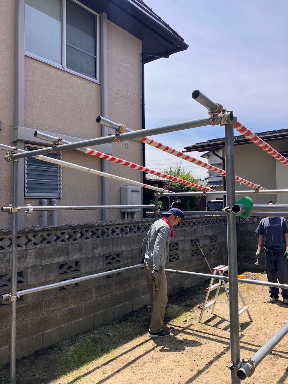 水平、直角を測りながら単管パイプを組んでいきます。
