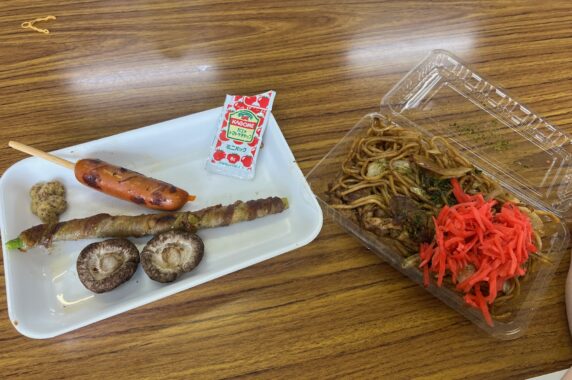 本日のメニューは、焼きそばやフランクフルト、アスパラの肉巻きや椎茸焼きなど、のぞみふぁーむの野菜やきのこをたっぷり使ったお祭りメニューです。