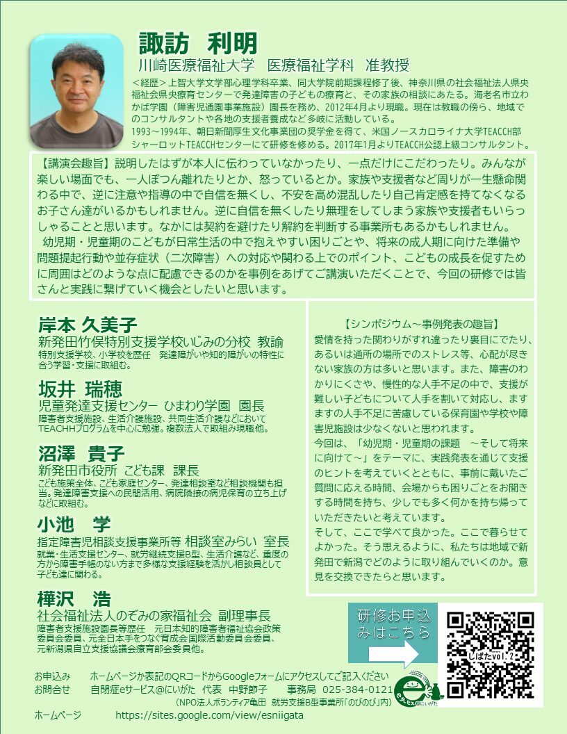 午後は、シンポジウム「幼児期・児童期の課題」として、実践報告と意見交換が行われました。法人の樺沢副理事長司会のもと、新発田市こども課、相談室みらい、新潟県立竹俣特別支援学校いじみの分校、児童発達支援センターひまわり学園のシンポジストとともに新発田市における現状の課題提起や、会場の質問を含め、諏訪利明先生からご助言をいただき意見交換を行いました。