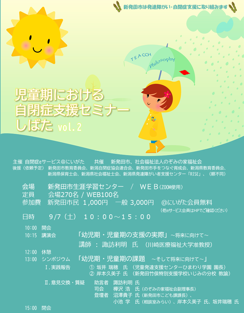 令和6年9月7日(土)に新発田市生涯学習センターにて開催されました。自閉症に携わる保育士、児童発達支援事業所・障がい福祉サービス事業所の職員、教職員、保護者、相談事業所、関係機関、行政、地域の方等、約170名のご参加がありました。