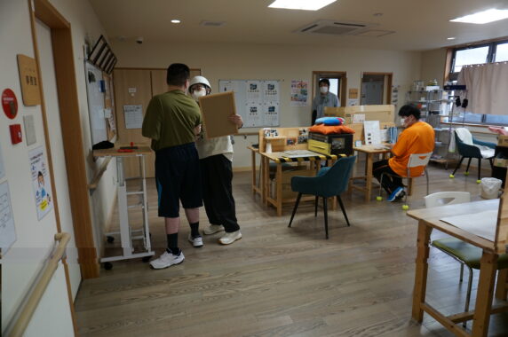 利用者数名とあおの風に実習に来ている学生も土嚢積みの訓練に参加しました。
