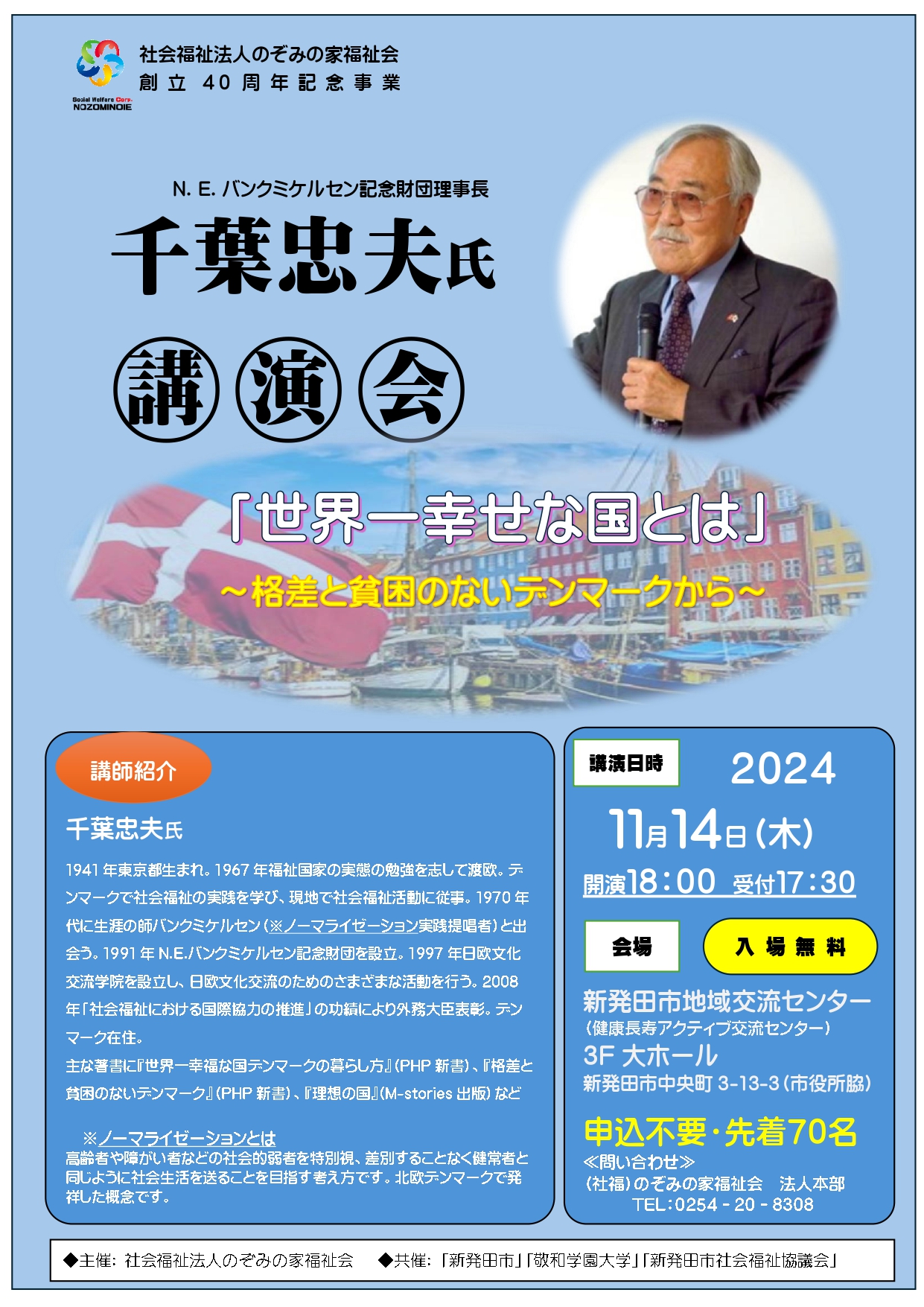 講師には、「ノーマライゼーションの父」と呼ばれたN.E.バンクミケルセンの薫陶を受けられ、デンマークの地から社会福祉の国際的な発展にご尽力されている千葉忠夫様(N.Eバンクミケルセン記念財団理事長)をお招きし、貴重なご講演を賜ります。