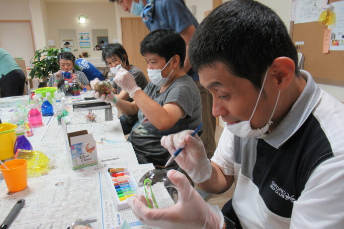 創作活動では、利用者さんたちが中心となって季節ごとにアート作品を制作しています。関連施設内で展示をするなど、事業所外との連携も実施し、少しでも活動を知ってもらえるよう努めています。